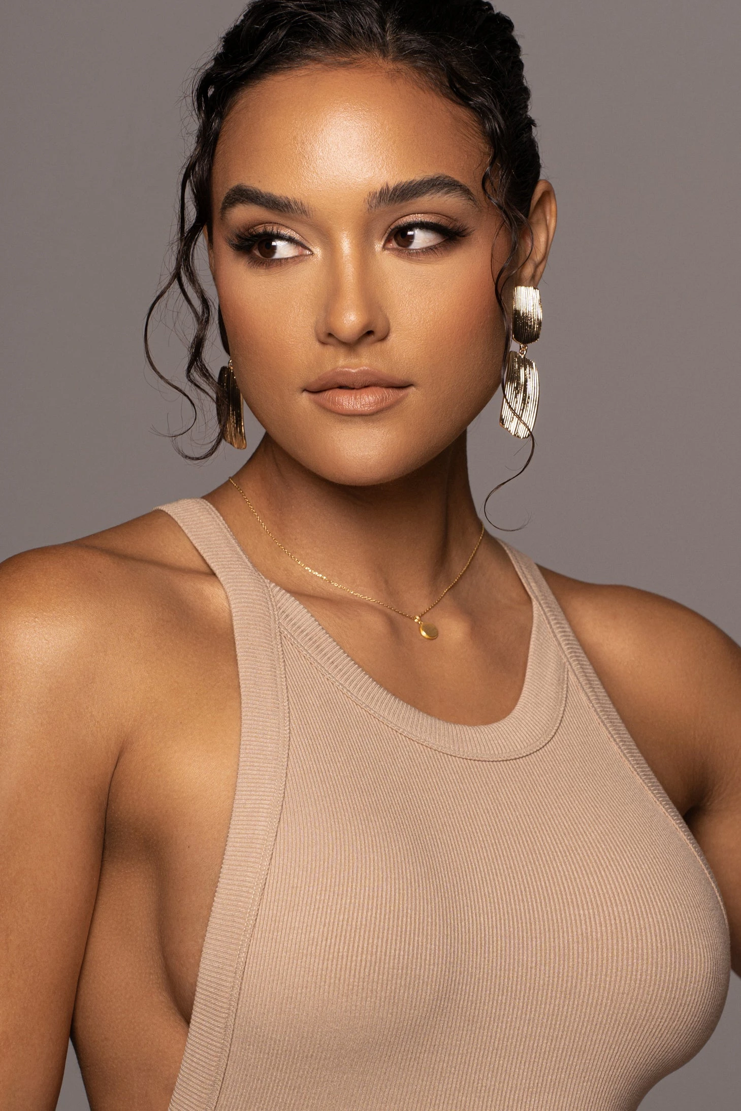 EXCLUSIVELY DESIGNED BY US FOR YOU. Our BEIGE SOUL SEARCHING DRESS is an effortless classic. This essential midi dress is designed in a fully ribbed material and features a round neckline with non-adjustable tank shoulder straps that highlight a stylish cutout back. Stretchy.