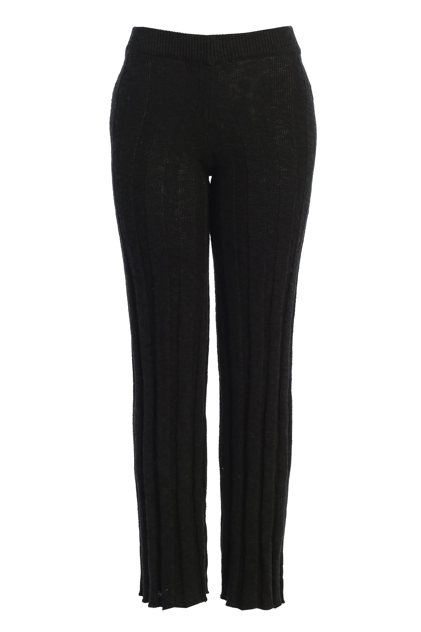 Keep things cozy in our Noir West Bound Sweater Set. Crafted in a soft ribbed knit fabric, this stretchy lounge set features a relaxed tank with a v-cut neck and classic hem. The matching pants are topped with an elastic waistband and end in flared hems. Lettuce cut trims. Sold as set.