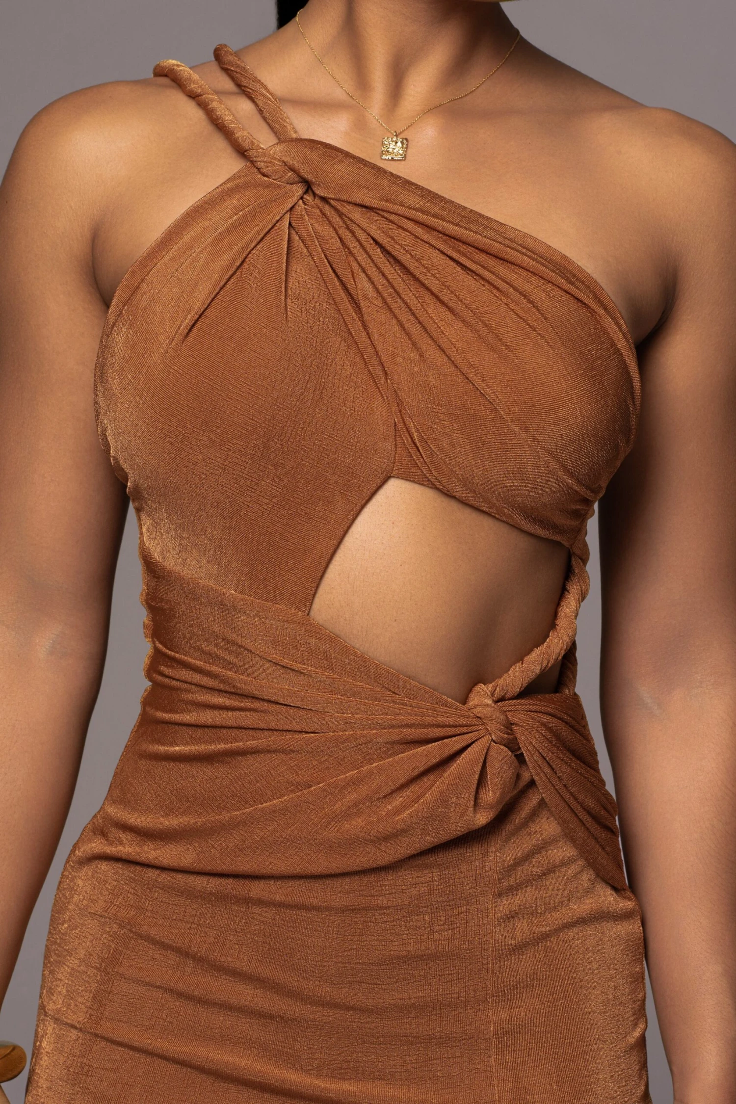 Turn heads in our stylish Brown Scarlet One Shoulder Maxi Dress! Highlighting a sleek one shoulder neckline, this stunning occasion dress details an eye-catching thigh slit with a cutout waist, back zipper closure, and maxi length hem. Crafted in a luxe slinky fabric for premium quality and comfort. Double lined. Stretchy.