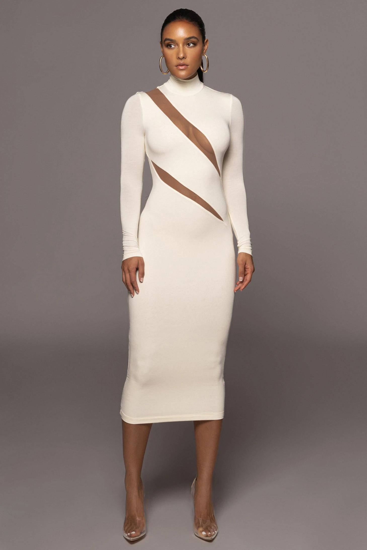 Steal the spotlight every time in the Buttercream Abigail Midi Dress. Crafted in a mix of mesh and soft jersey, this long sleeve mock neck dress is designed with stylish mesh panels in a modern asymmetrical pattern across the front/back bodice. Stretchy. Double lined.
