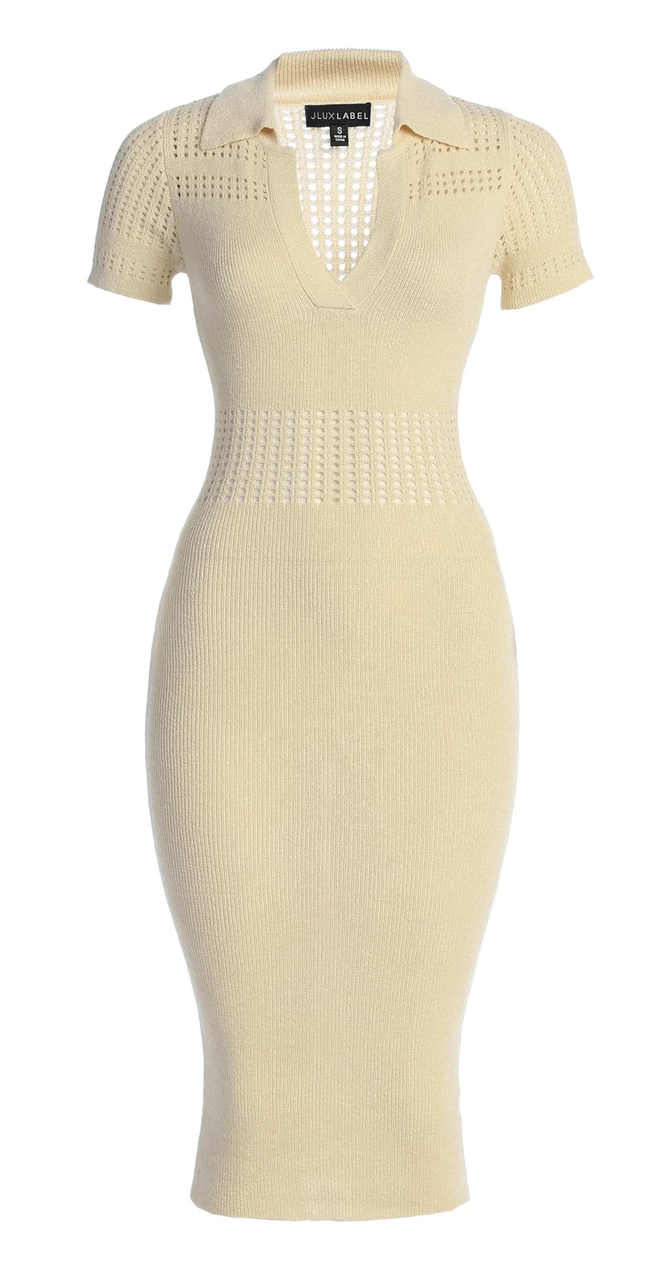You’ll be completely drawn to our Buttercream Venice Collared Midi Dress. This versatile midi dress showcases a classy collared neck with short sleeves and a curve hugging silhouette. Crafted in a blend of knit and see-through crochet material, this transitional staple can be worn through the seasons. Single lined. Stretchy.
