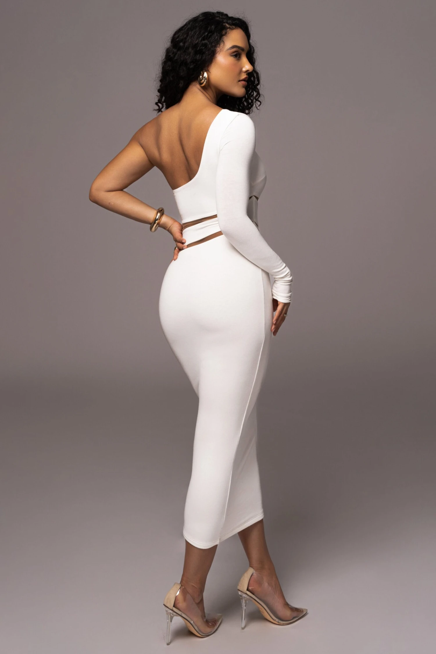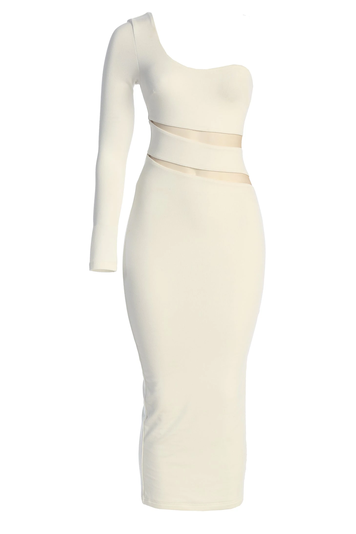 They’ll only have eyes for you when wearing the Ivory Chase The Night One Shoulder Dress. Designed in a captivating mix of mesh and soft jersey, this classy one shoulder midi dress features mesh panels in a modern asymmetrical pattern going across the front/back waist down to side hem. Stretchy. Double lined.