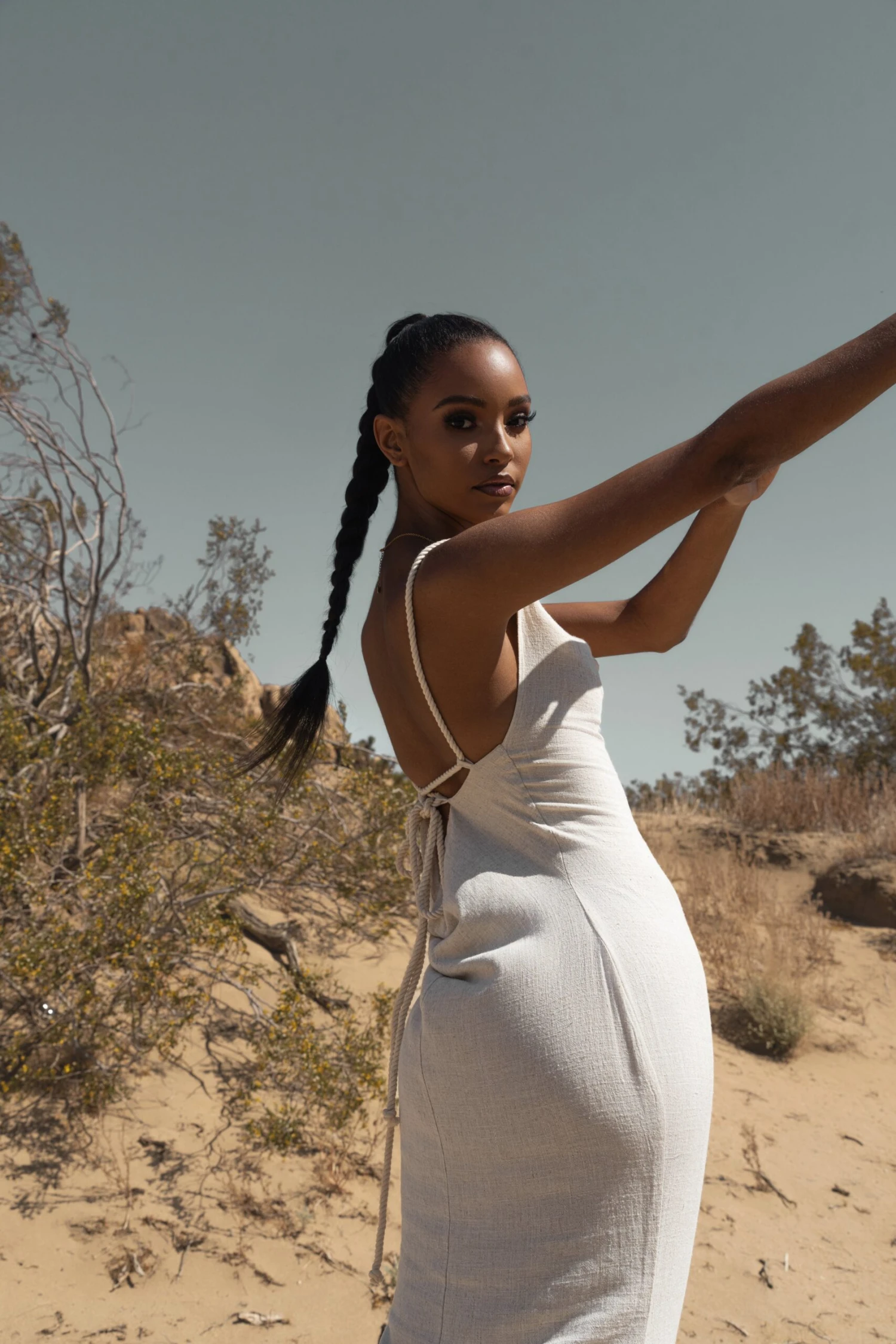 Our new Natural Adventure Awaits Linen Maxi Dress exceeds all summer wear expectations. Crafted in a premium linen blend, this stunning maxi dress features a relaxed silhouette with a cowl neckline and is adorned with adjustable rope straps that lead towards the back, providing a flexible fit. Minimal stretch. Double lined.
