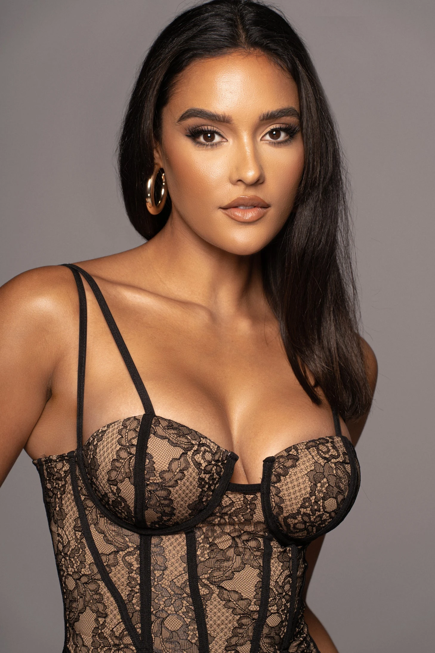 Lovely in lace with our Noir Katerina Lace Dress. This gorgeous curve-hugging dress features a sweetheart neckline with a bustier style bodice, and a back slit at the lower hem. Stunning piping detail throughout elevates the glamour of this midi length dress, complete with adjustable shoulder straps and back zipper for closure. Gold tone accents. Lined interior. Some stretch.