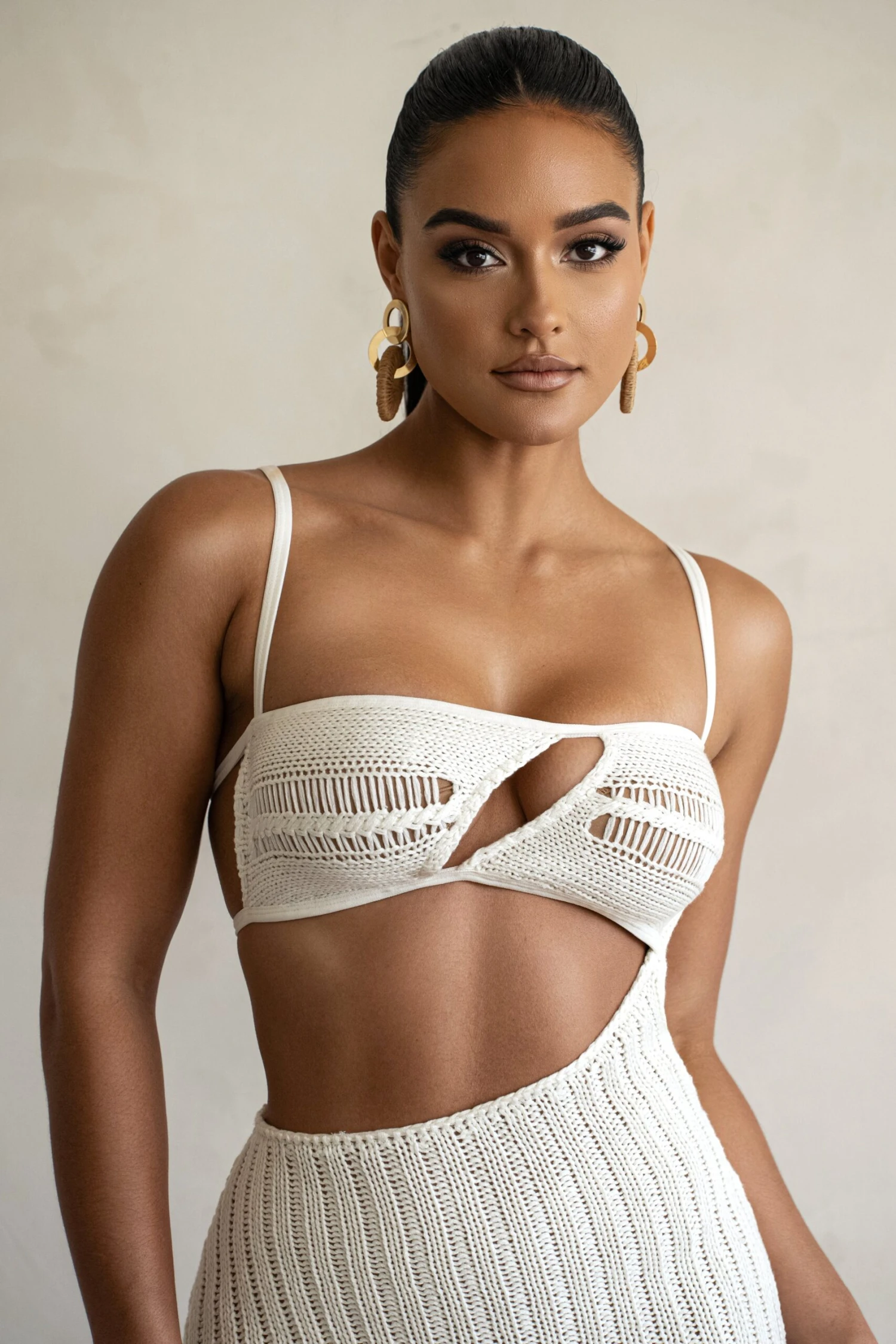 City meets coastal style in our new Off White Coastal Escape Dress. Crafted in a crochet knit fabric, this sleek midi dress features a square neckline with adjustable shoulder straps and two back straps with adjustable fastening. A cut at the chest and waist adds a touch of allure. Double lined. Stretchy.