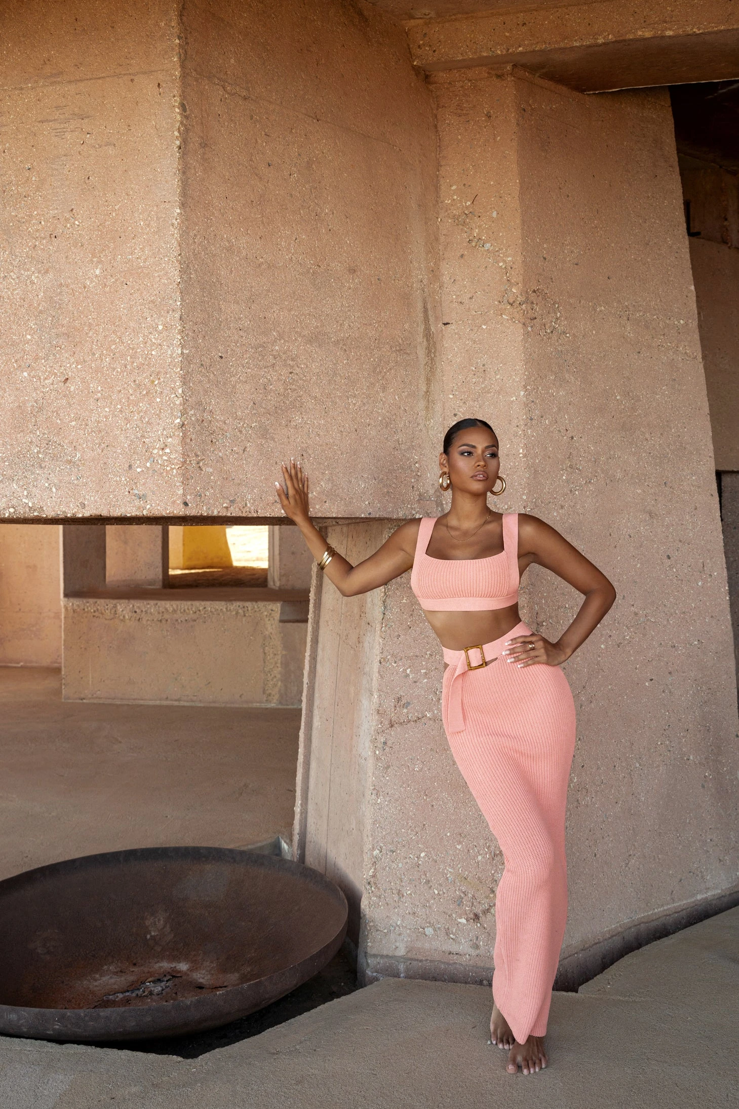 The Peach Nikole Ribbed Skirt Set is a match made in paradise! This form fitting skirt set features a lovely crop top cut with a squared neckline, fixed shoulder straps, and an open back detailing a squared bamboo buckle. The matching maxi skirt comes with a pencil silhouette, cut-out sides at the hip, and a squared bamboo buckle. Stretchy. Split back hem. Sold as set.