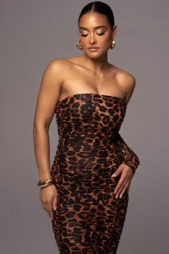 Add show stopping prints to your wardrobe with our Pecan Leopard Midnight Hour Maxi Dress. Crafted in a soft leopard-print burnout fabric, this sleek one of a kind maxi dress features a strapless neckline with a back slit hem and a figure-hugging silhouette. Side zipper closure. Double lined with stretch.