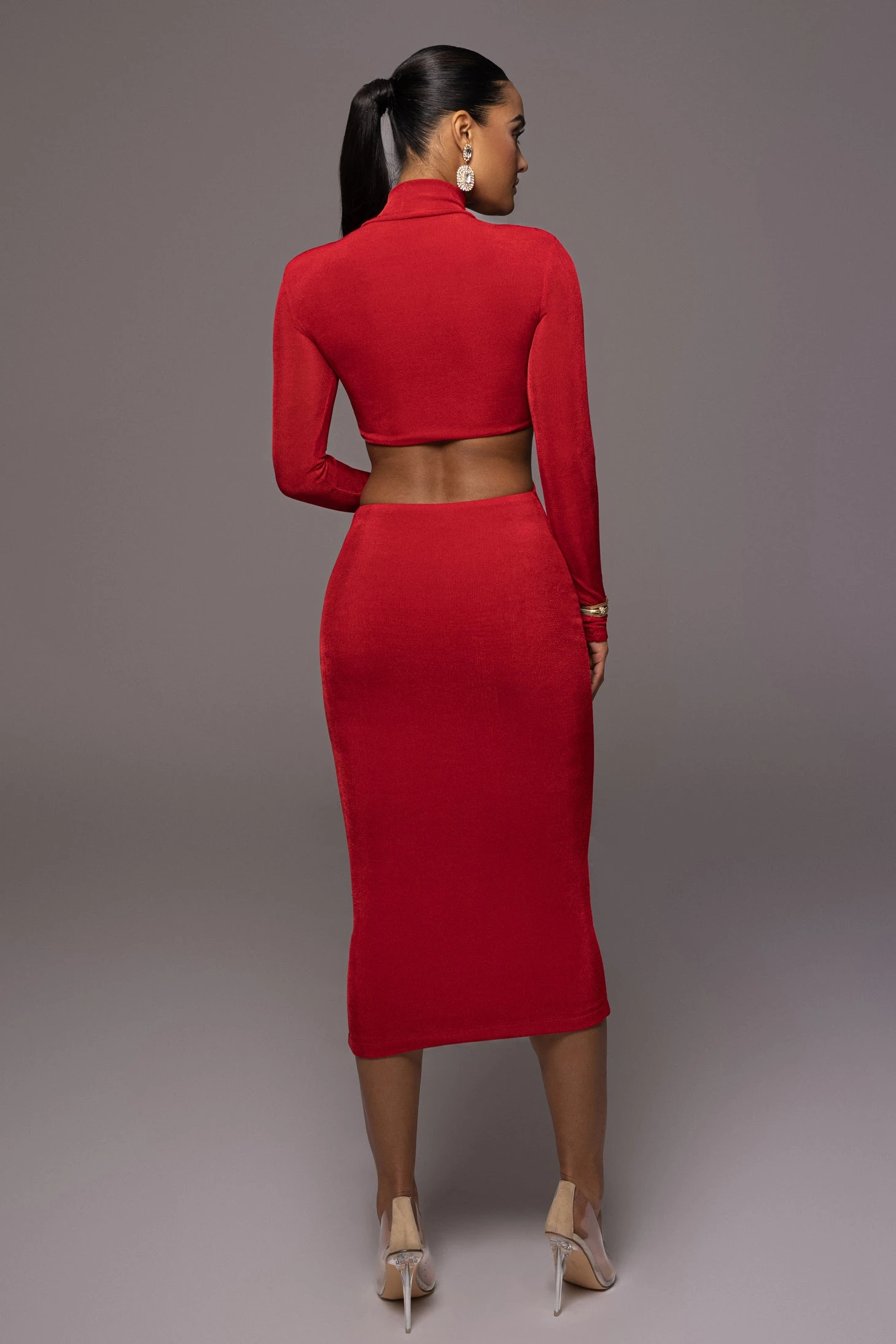 Achieve effortless style with sleek elegance in the Tango Red Made For You Dress. This classic mock neck dress has been luxuriously reimagined in a soft slinky fabric featuring long sleeve arms with a bold cutout back to accentuate your waist. Padded shoulders add a sophisticated finish. Stretchy. Double lined.