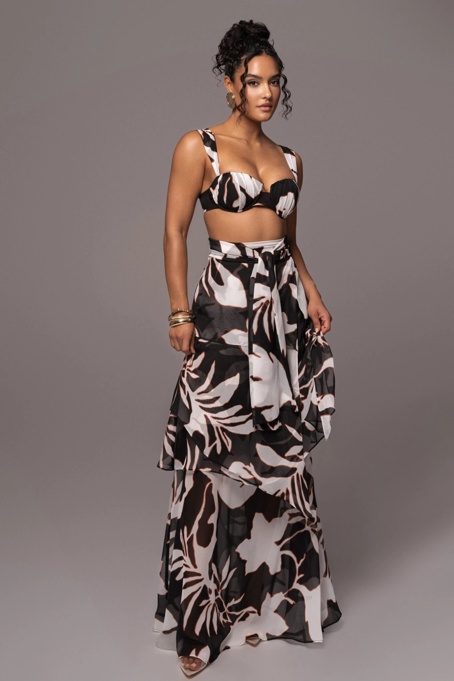 Our White Floral Printed Love Two-Piece Set sets a romantic tone all summer in a lovely floral pattern. Featuring a pleated bra top with padded cups, adjustable shoulder straps, and hook and eye closures. The matching skirt features a tie waistband and ruffled tiers cascading down to the maxi hem. Crafted in breathable chiffon material keeping your style on a fresh note all season. Single lined. Sold as set. Minimal stretch.